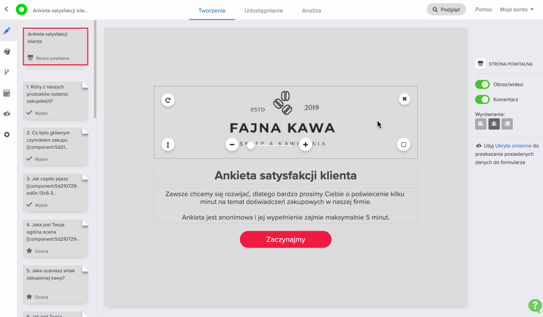 W celu wydrukowania przygotowanego w interankietach formularza, przejdź do zakładki Udostępnianie. Na dole strony znajduje się przycisk umożliwiający pobranie ankiety do PDF'a.